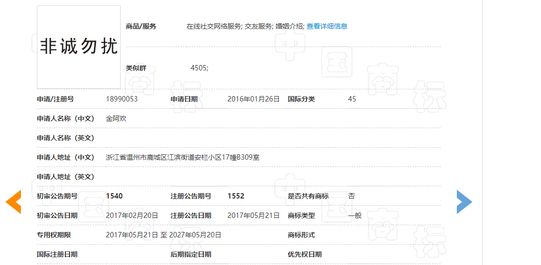 | 溫州商標申請人金阿歡,相信大家都不陌生,就是那位憑藉自己手中的一件“非誠勿擾”商標,讓浙江衛視人氣爆棚的《非誠勿擾》電視節目被迫改名《緣來非誠勿擾》。 |